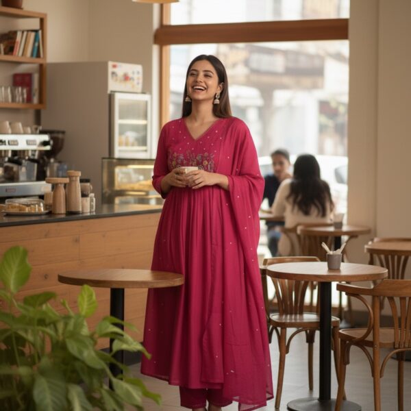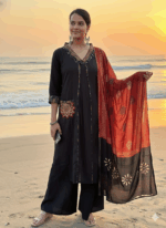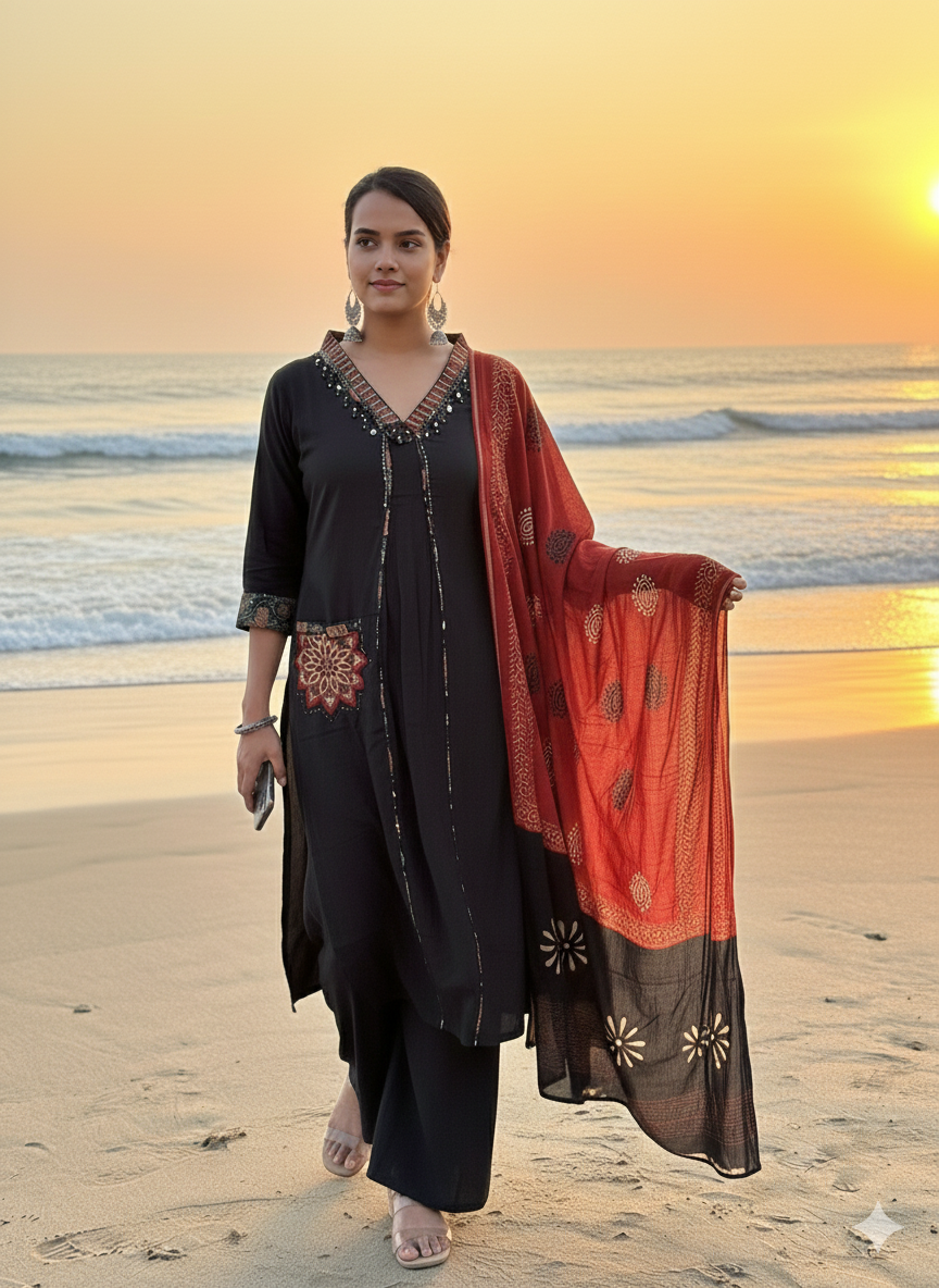 Elevate your ethnic style with this elegant black embroidered kurta set, paired with a flowy palazzo and a striking red–black printed dupatta. Designed for comfort and refined charm, this set is perfect for festive gatherings, casual outings, or everyday elegance.