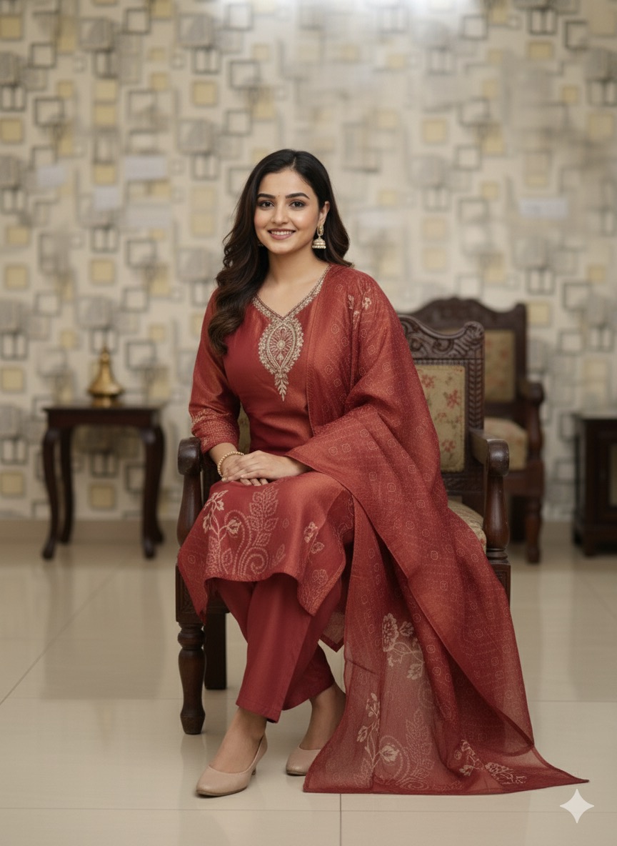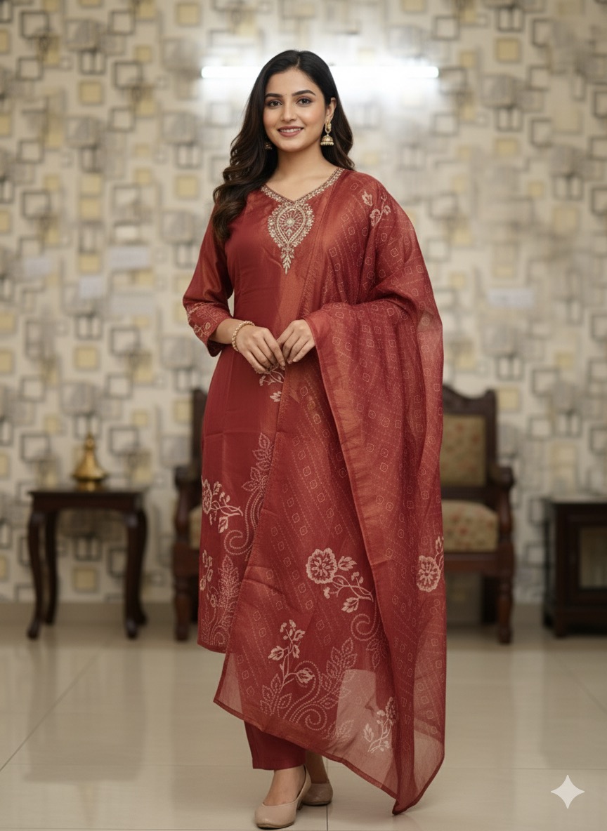 Shine bright this season with our captivating Copper Tissue Ensemble. This outfit combines the lightweight luxury of tissue fabric with the vibrant, traditional artistry of Bandhani print, perfect for special occasions.