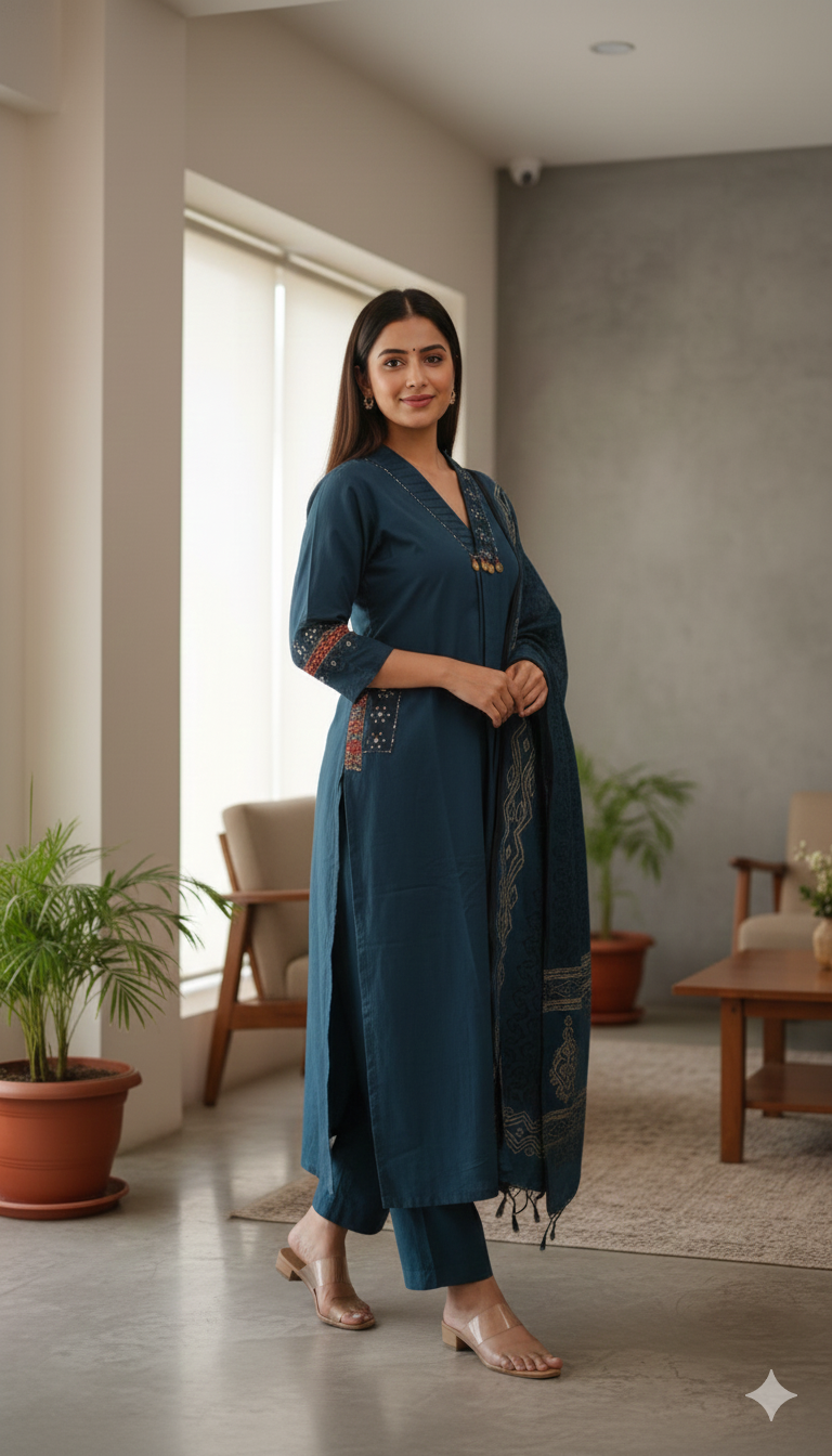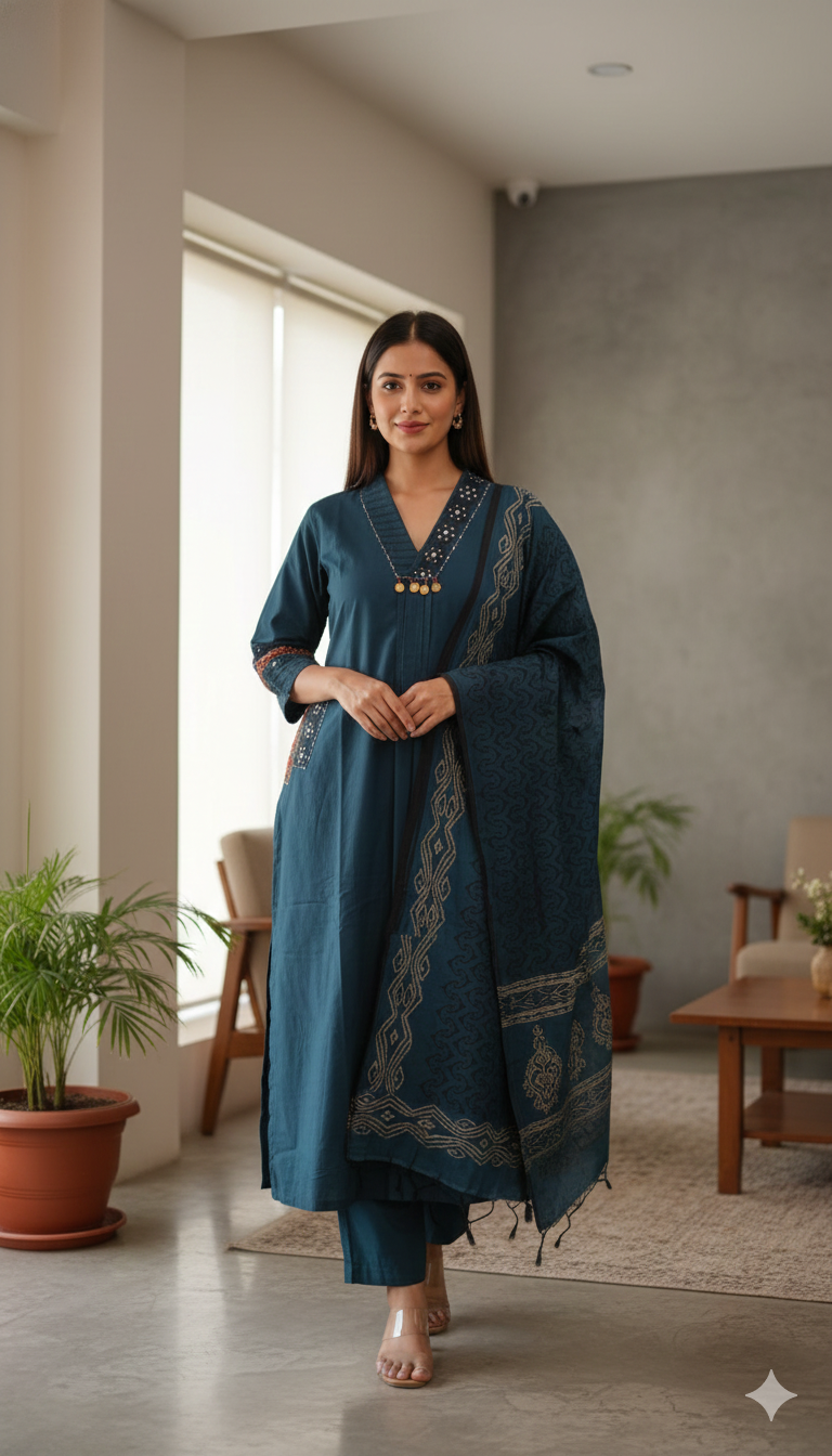 Embrace effortless grace with our Handcrafted Mul Cotton Salwar Set in a deep, soulful blue. Designed for the modern woman who values both comfort and traditional artistry, this set is a perfect blend of breathable fabric and intricate detailing.