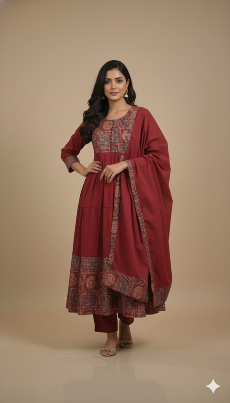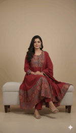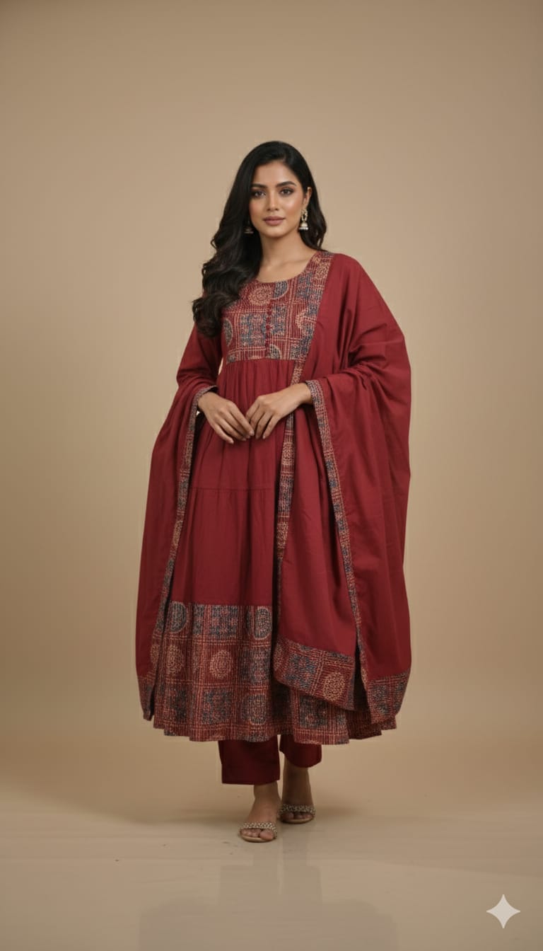 - Silhouette: A graceful, tiered Anarkali cut that offers a flattering flare and effortless movement.