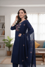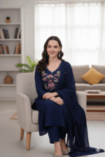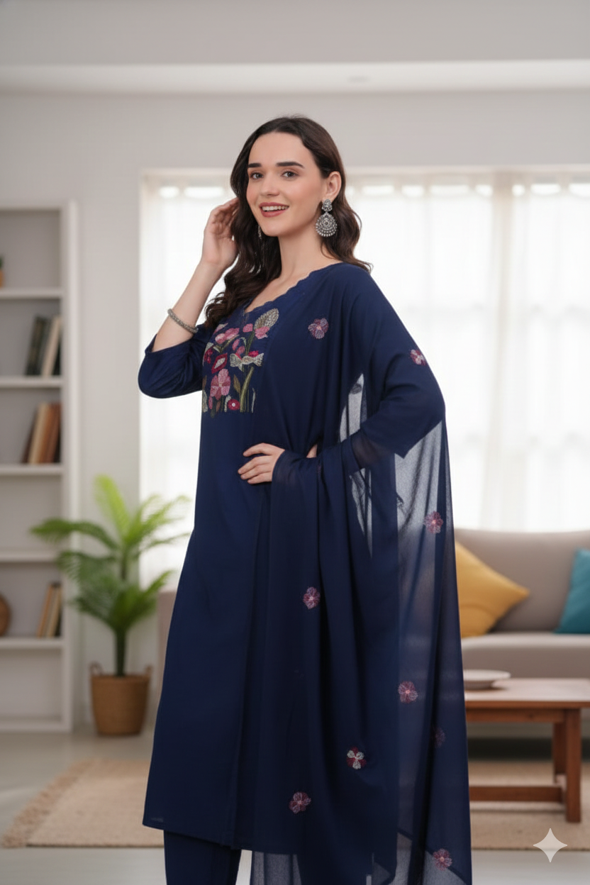 The rich navy blue tunic (Kurta) features a flattering V-neckline adorned with intricate, vibrant floral embroidery that adds a touch of artisanal sophistication. Paired with matching slim-fit trousers and a sheer, lightweight dupatta with coordinated embroidery, this 3-piece set is a versatile must-have for your wardrobe.