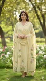 Elevate your ethnic wardrobe with this exquisite 3-piece Anarkali Salwar Set, a perfect blend of understated luxury and artistic craftsmanship. Crafted from premium Mul Chanderi fabric, this ensemble offers a sophisticated sheen and a lightweight, graceful drape.
