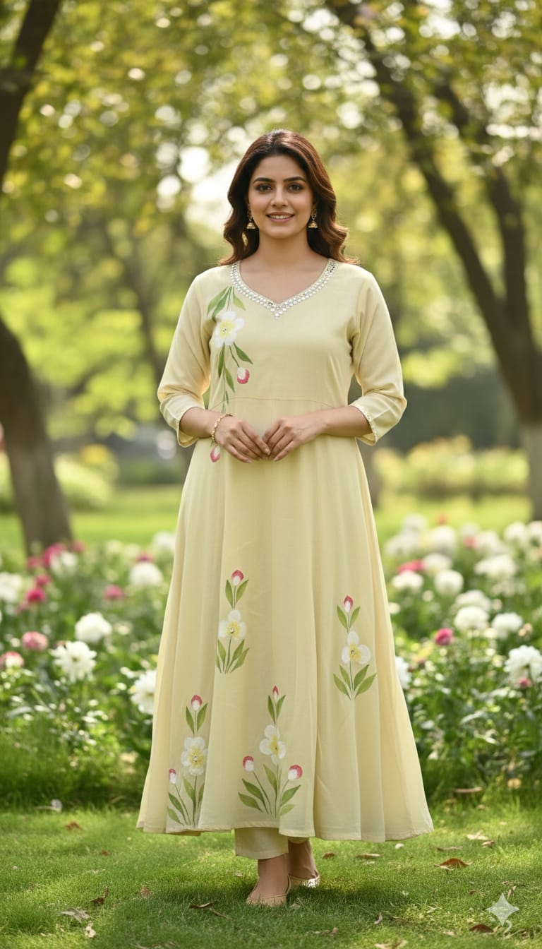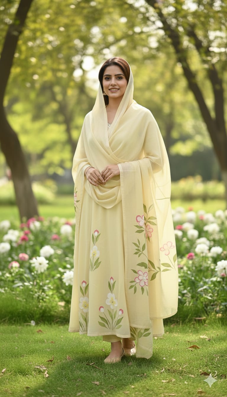 Artistic Detail: Adorned with beautiful hand-crafted Brush Paint floral motifs across the kurta and dupatta, adding a unique, artisanal touch.