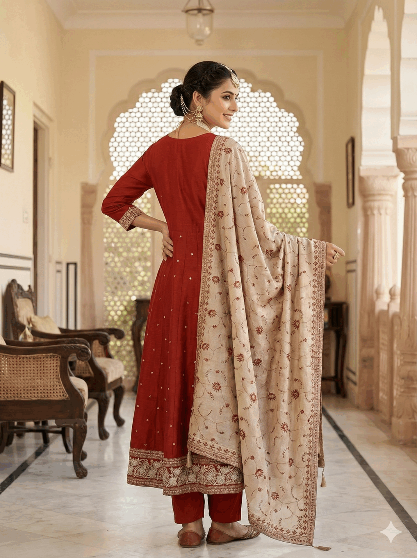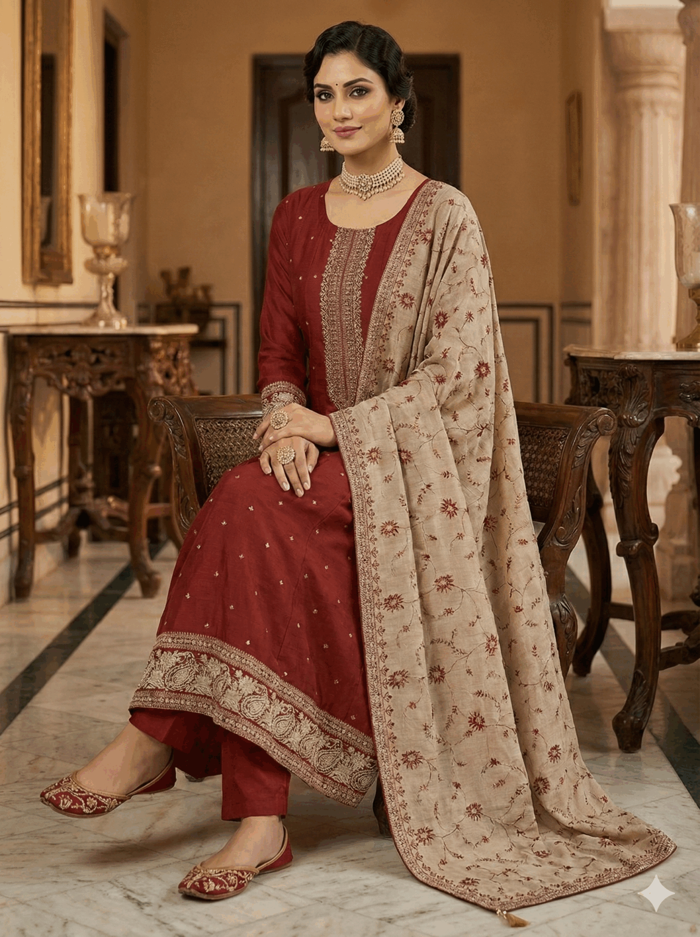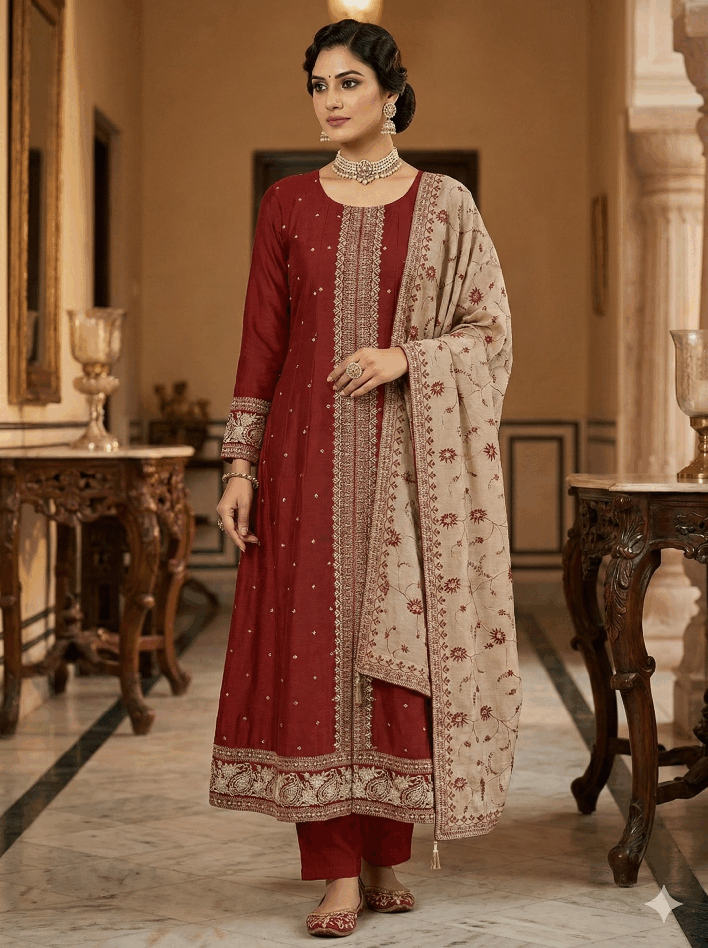 Crafted from rich, sheen-finished fabric, this Anarkali suit strikes the perfect balance between traditional grandeur and modern sophistication.Completing the look is a breathtaking contrast dupatta in beige, lavishly embroidered with floral motifs that echo the color of the suit, creating a harmonious and regal ensemble.