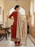 Be the first to review “Ethnic wear – Anarkali -Rust orange Embroidered Silk Anarkali Suit Set with Contrast Dupatta” Cancel reply