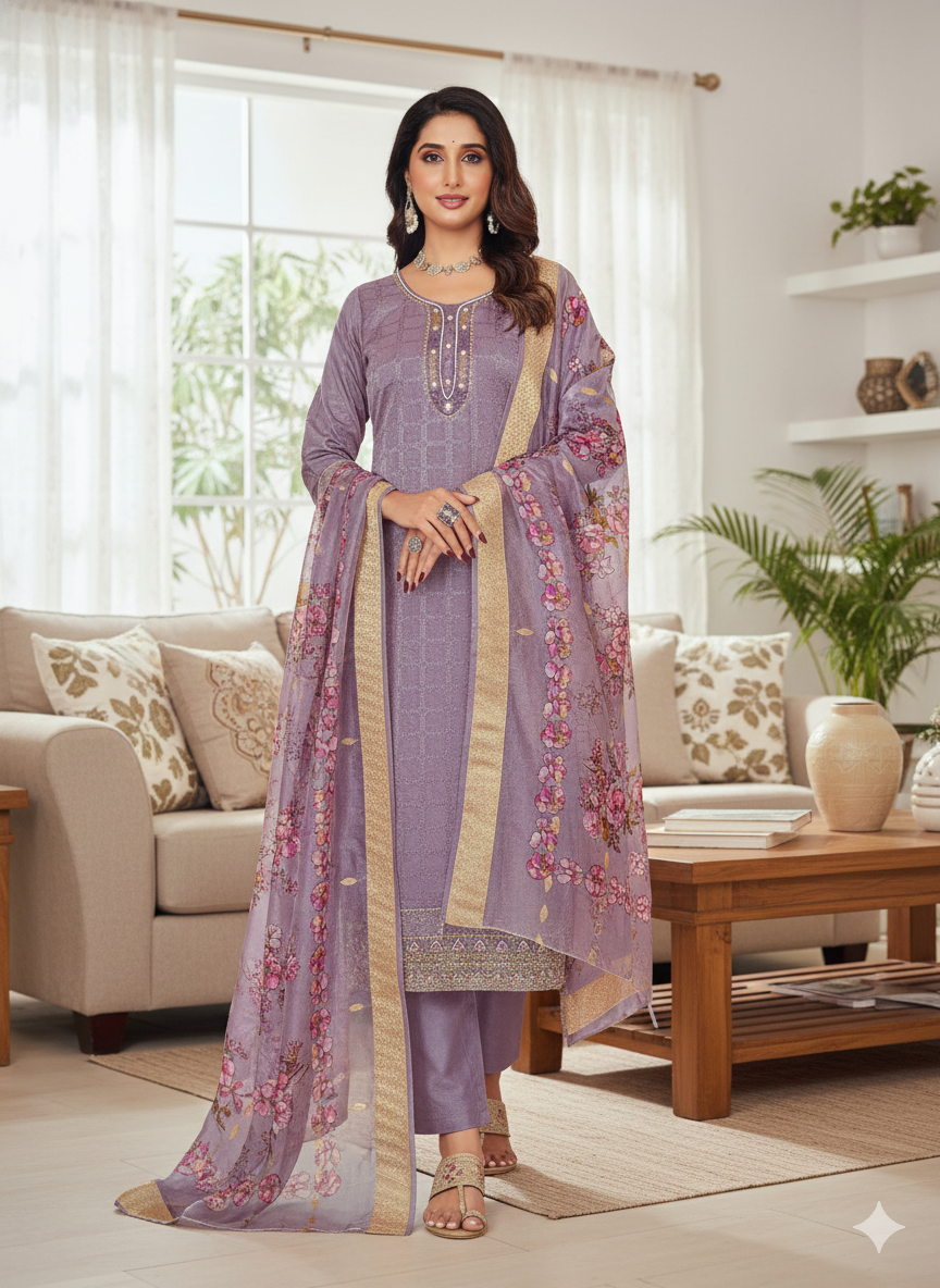 Ethnic wear – soft silk with Aari work Suit Set with Floral Dupatta
