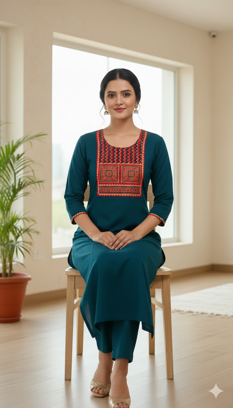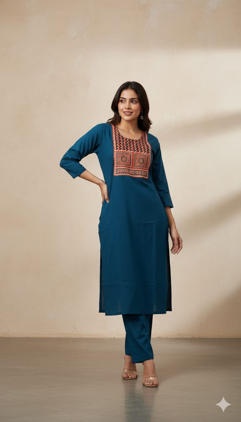 Artisanal Detailing: The top features a stunning intricate neck patch work with vibrant geometric patterns, adding a pop of color and traditional charm to the deep blue base.