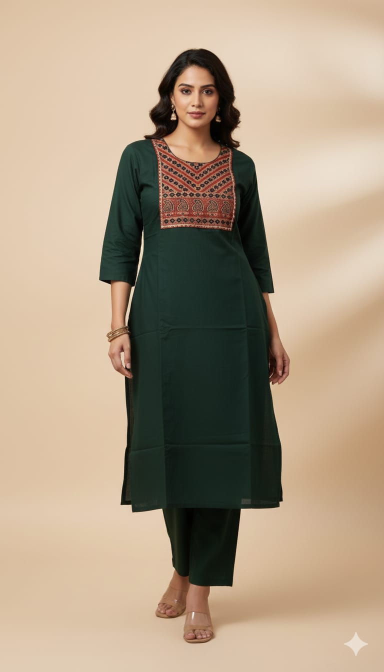 Elevate your everyday ethnic wardrobe with our Dark Green Gamti Cotton Set. This 2-piece ensemble blends traditional craftsmanship with a sophisticated, modern silhouette, making it a versatile choice for both office wear and casual gatherings.