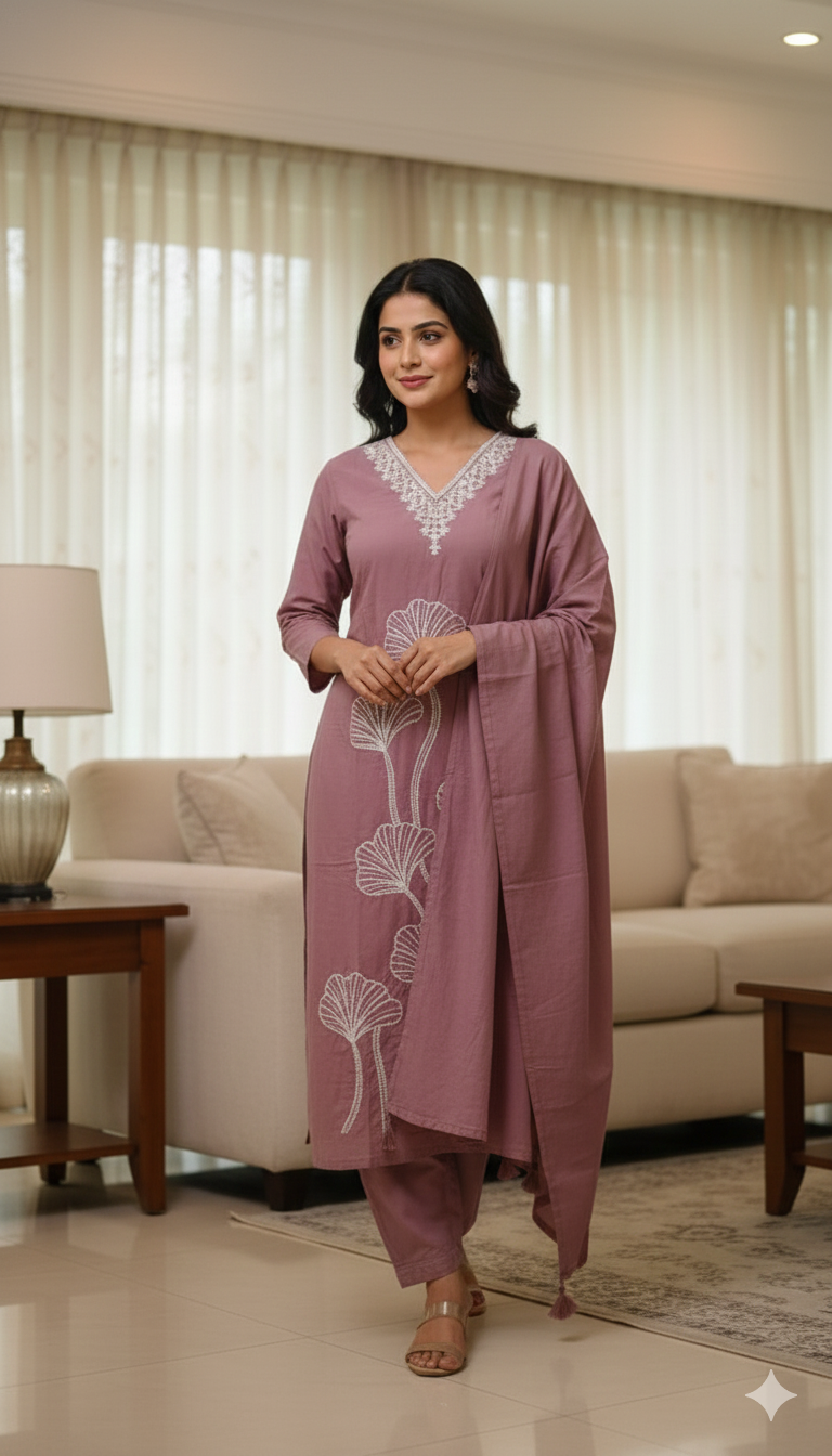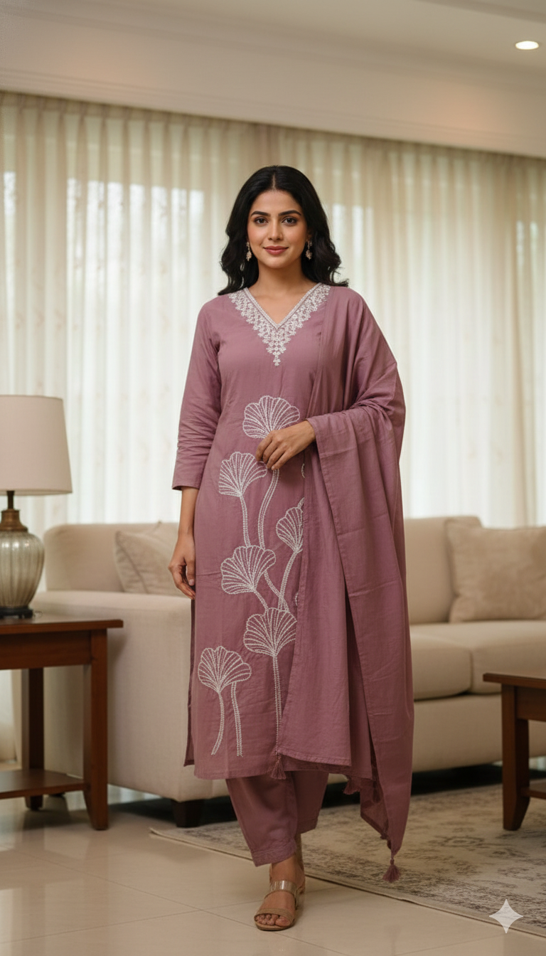 Top (Kurta): Features a flattering V-neckline adorned with intricate white lace-style embroidery. The front is highlighted by large, artistic floral ginkgo leaf motifs in white thread work, adding a contemporary touch to traditional wear.