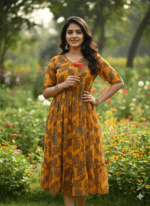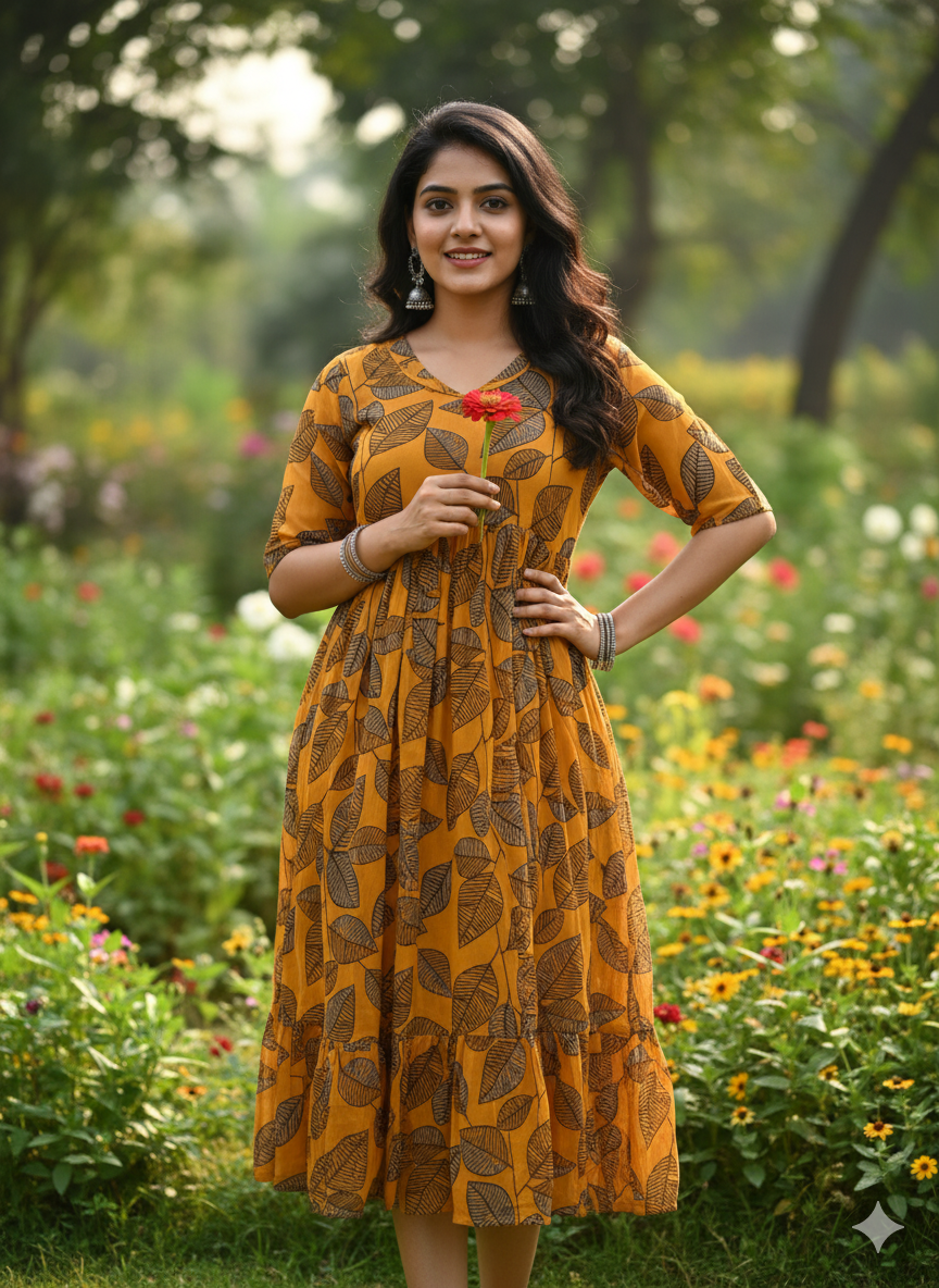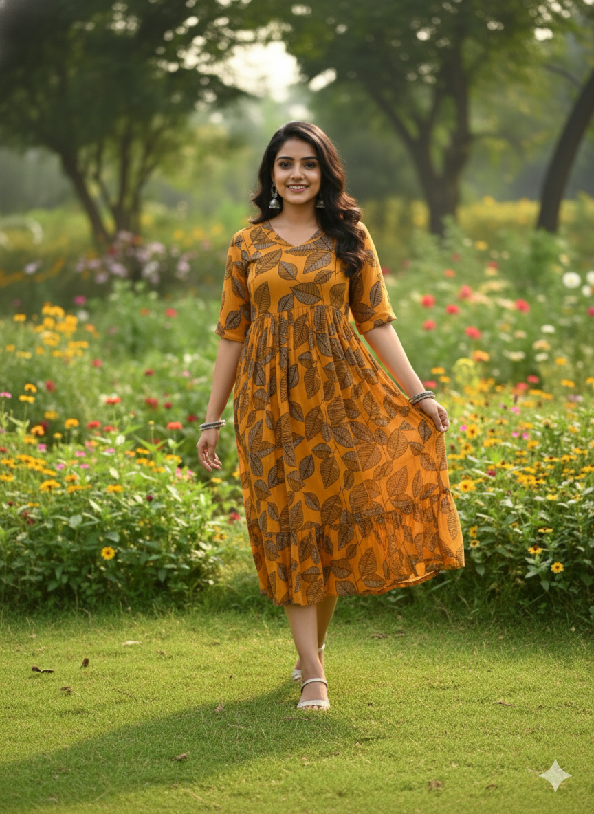 Elevate your everyday wardrobe with this stunning Mango (Mustard) color with leaf prints maxi. Combining traditional , this dress is designed for the modern woman who values both style and comfort. The breezy fabric and relaxed fit make it perfect for casual outings, office wear, or a brunch date.