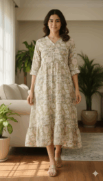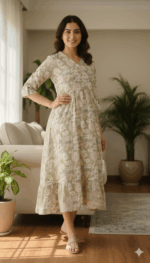 Silhouette: A flattering Gown-style (Anarkali) cut featuring a tiered ruffle hem that adds beautiful movement and volume.