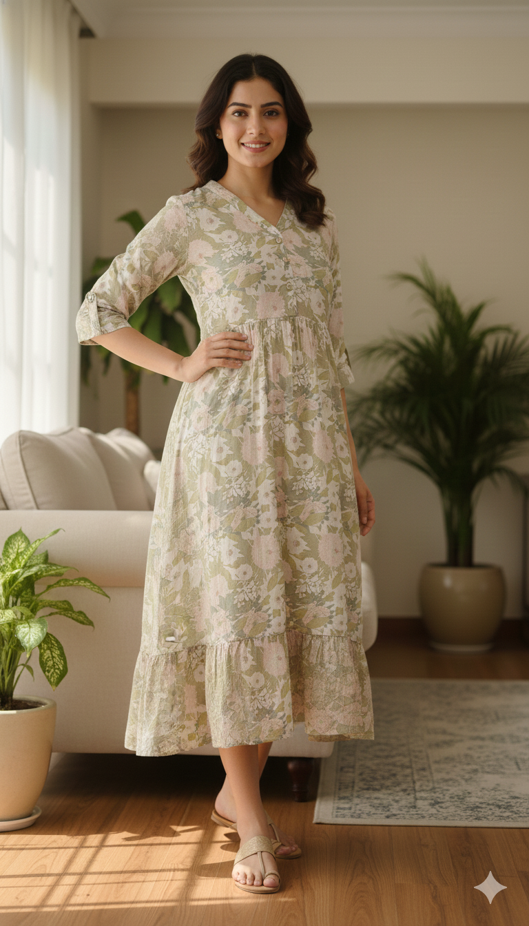Experience the perfect blend of traditional elegance and modern flare with our Pista Green Floral Gown-Style Kurti. Crafted from premium Chinon Silk, this piece is designed for the woman who loves a graceful, breezy silhouette with a touch of luxury.