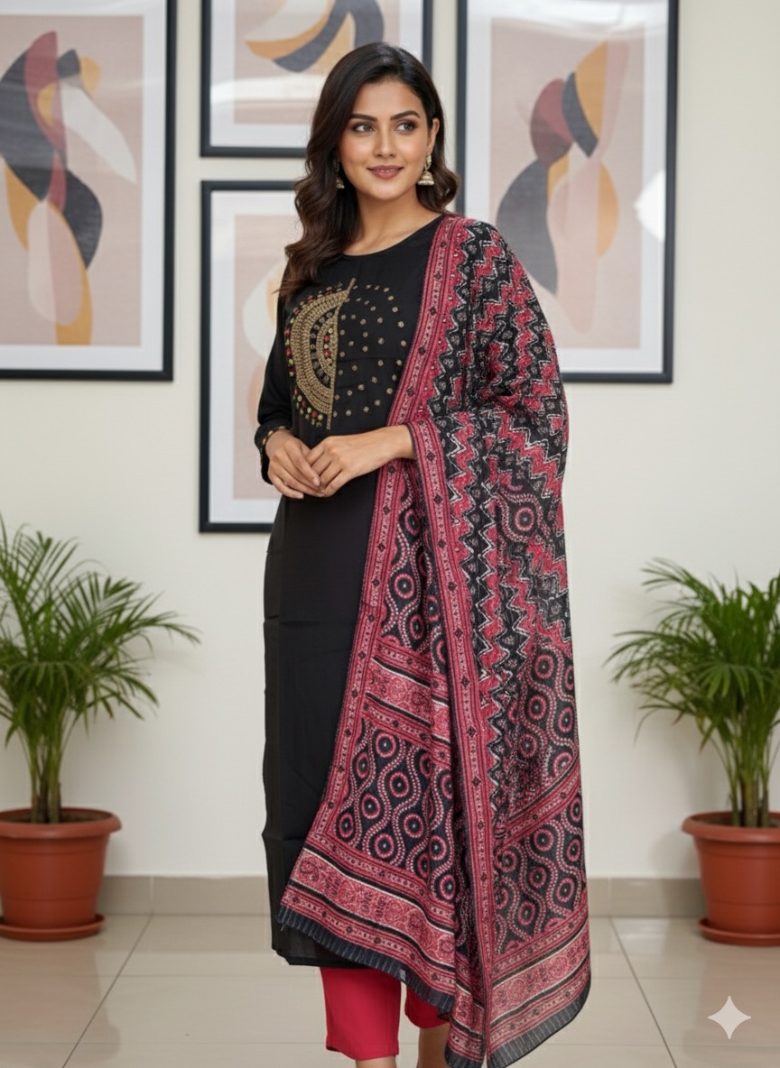 Flowy, elegant, and full of charm — this floral Anarkali features intricate prints and soft rayon fabric. Perfect for festive gatherings and family occasions.