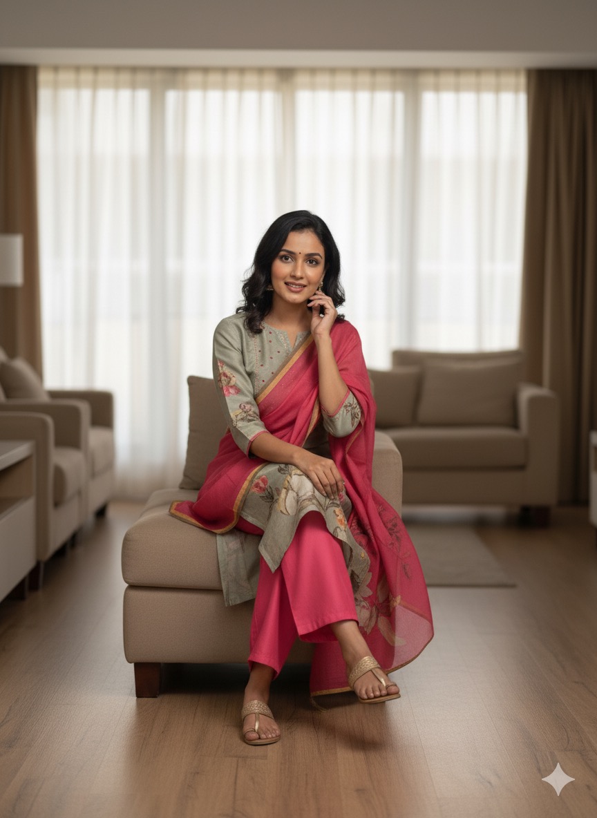 Flowy, elegant, and full of charm — this floral Anarkali features intricate prints and soft rayon fabric. Perfect for festive gatherings and family occasions.