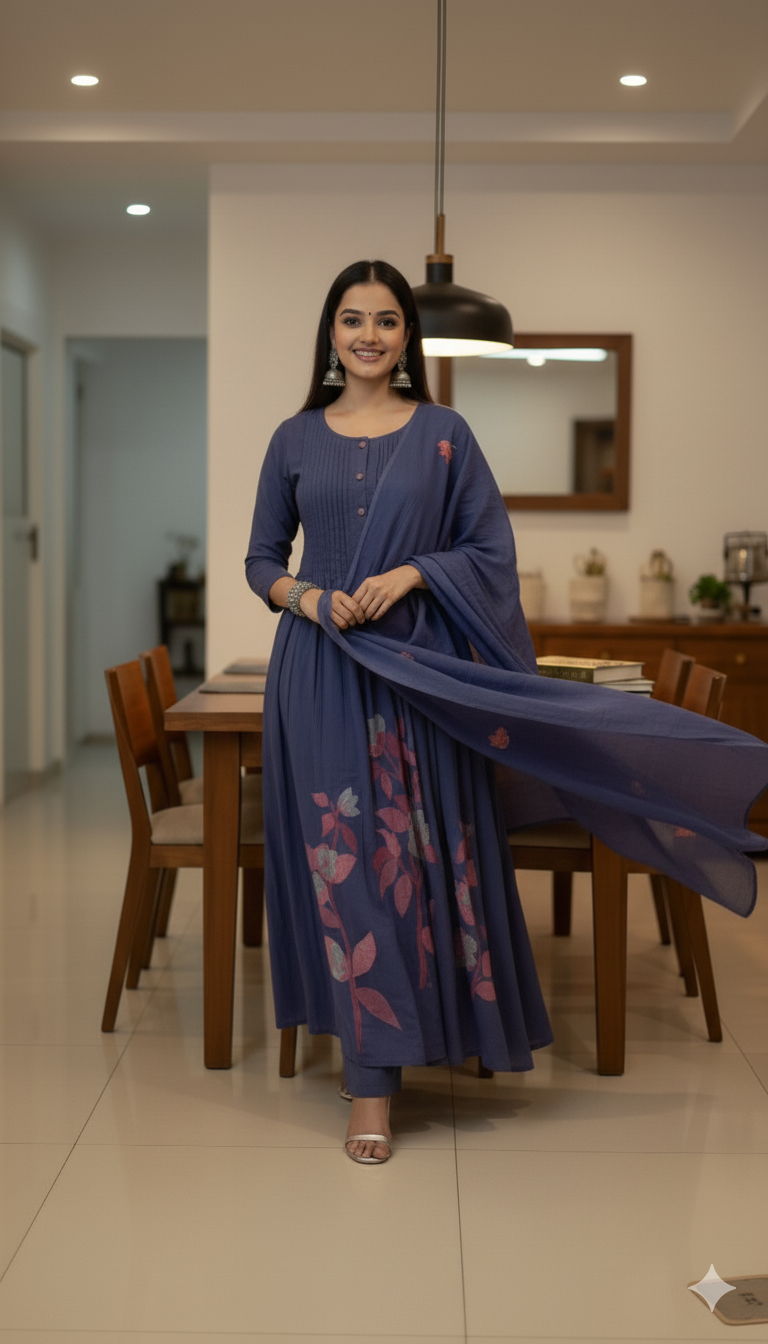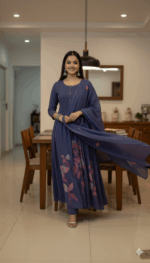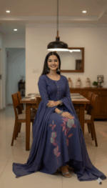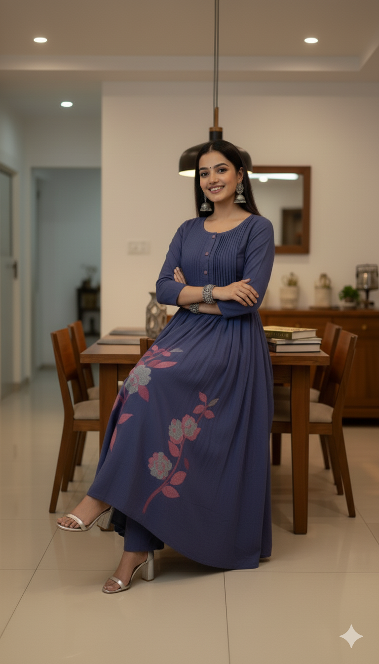 Flowy, elegant, and full of charm — this floral Anarkali features intricate prints and soft rayon fabric. Perfect for festive gatherings and family occasions.