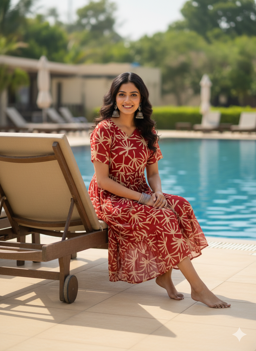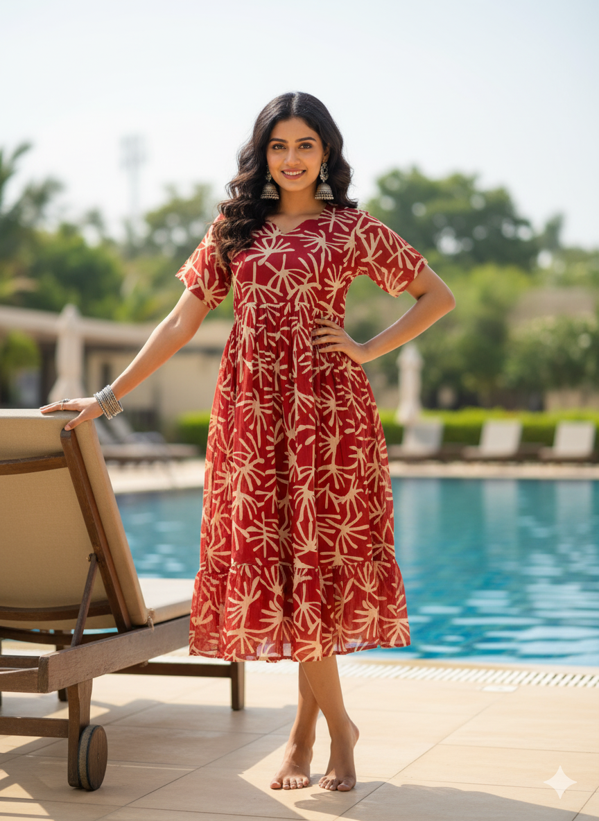 Designed for the free-spirited woman, this dress features a rich brick-red base adorned with a striking cream abstract palm-leaf pattern. The neckline and gathered waist offer a flattering, feminine silhouette, while the tiered ruffle hem adds a playful flow to your movement. Crafted from breathable, lightweight fabric, it is the perfect choice for a beach vacation, a poolside brunch, or a casual day out shopping.