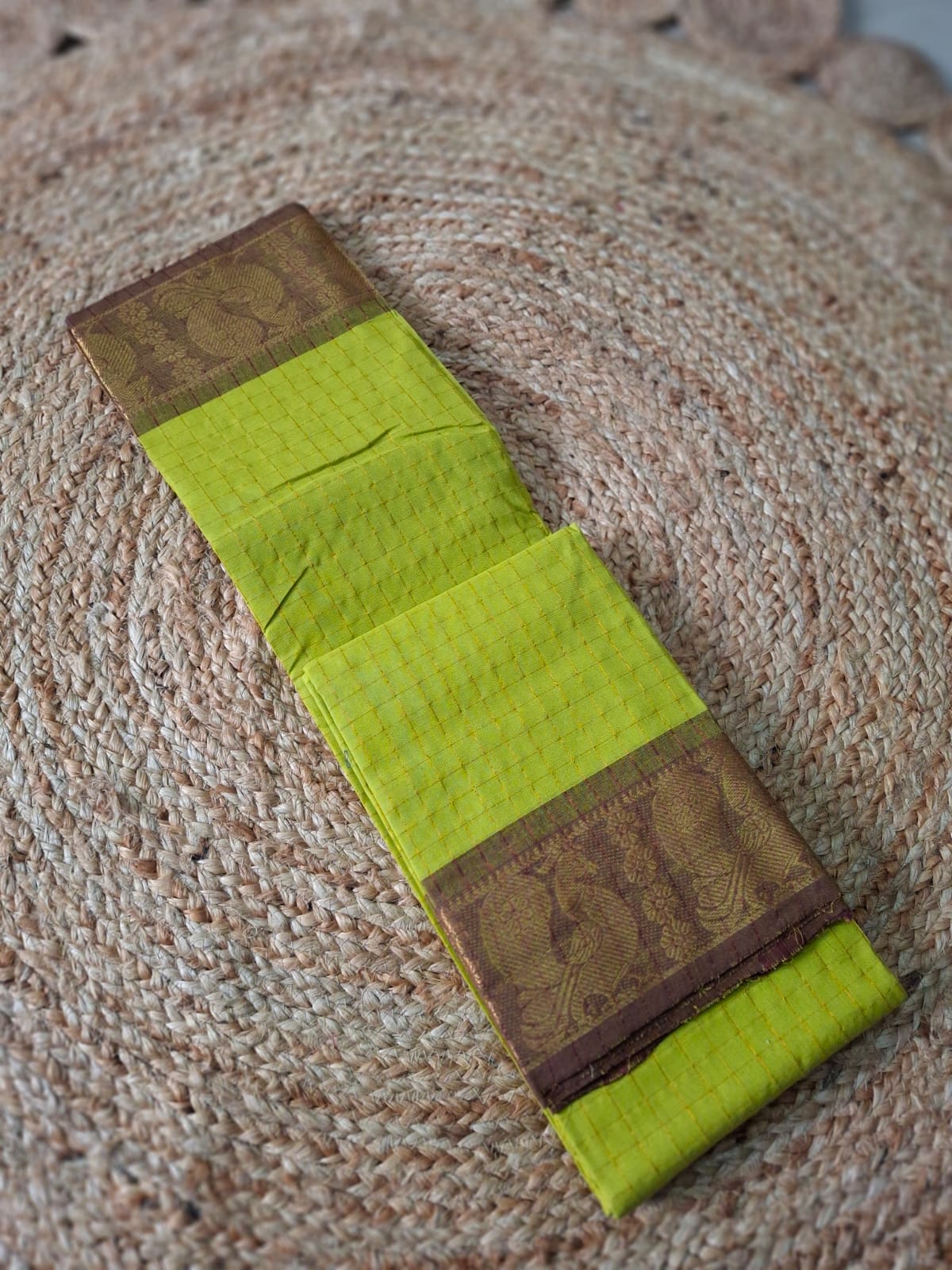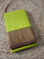 Drape yourself in the elegant charm of this traditional handloom Chungudi saree. Featuring a beautiful checked pattern unique to the Chungudi weave and framed by a rich Zari border, this saree promises an elegant look for any traditional occasion. It’s a perfect blend of comfort and classic South Indian artistry.