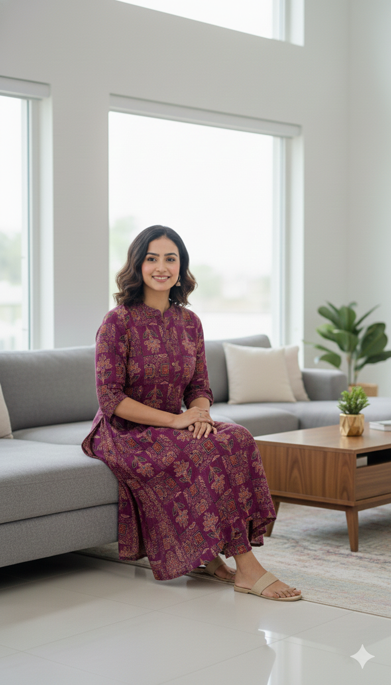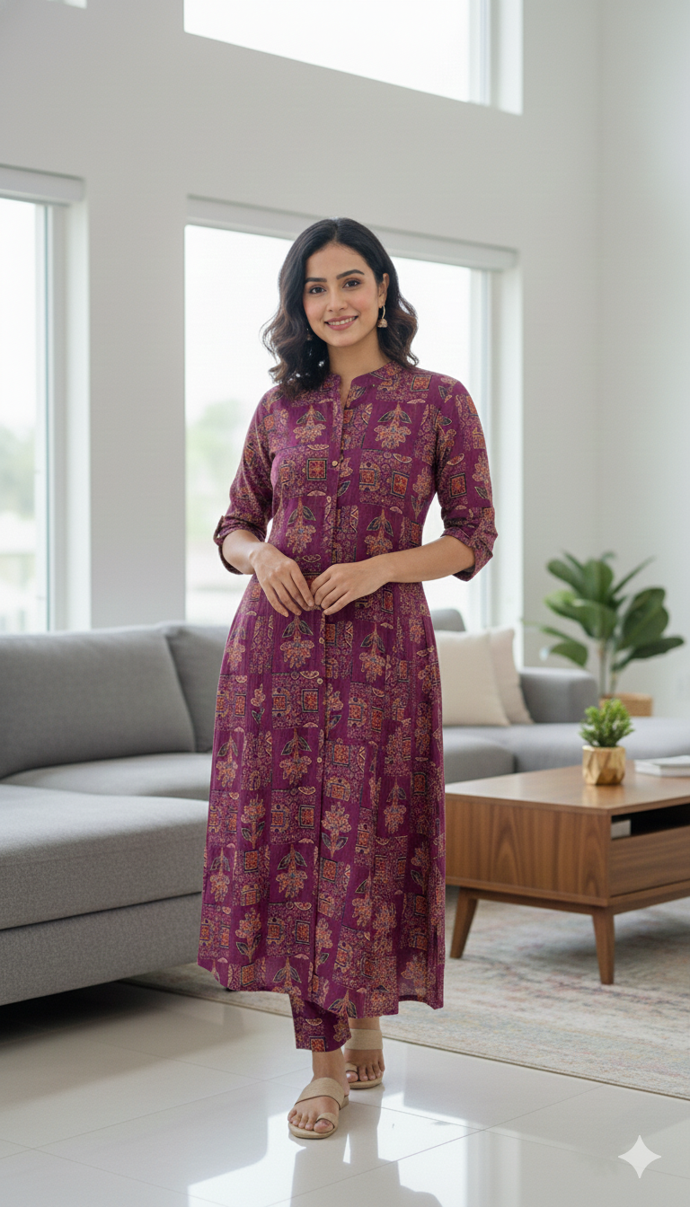 Experience the perfect blend of traditional artistry and modern silhouettes. This two-piece co-ord set is crafted from breathable, premium cotton, featuring the timeless Ajrakh print in a rich, sophisticated Wine hue. Whether you’re heading to the office or a casual brunch, this set offers effortless elegance and all-day comfort.