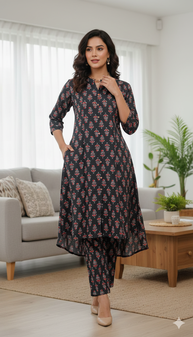 Elevate your everyday style with our Midnight Bloom Coord Set, a perfect fusion of traditional charm and modern silhouette. This sophisticated two-piece ensemble features a deep black canvas adorned with intricate, vibrant floral motifs, creating a look that is both timeless and trendy.