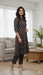 Women’s Navy Blue Cotton Blend Kurta Set with Gold Print – Office & Casual Wear