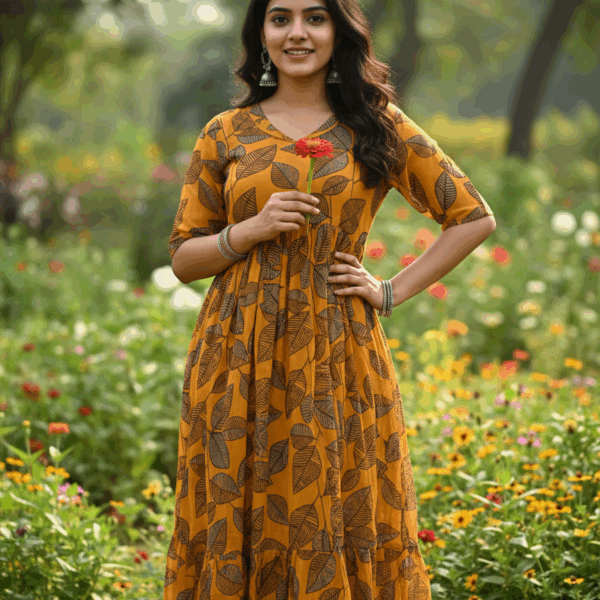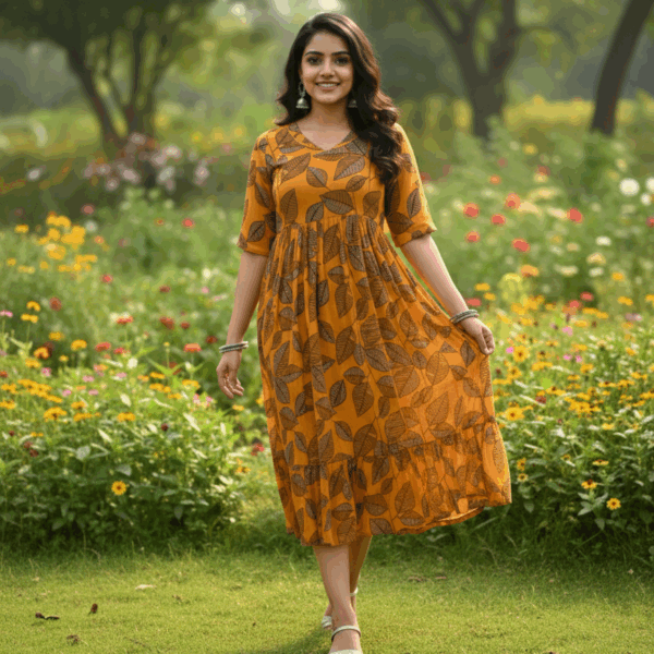 Rustic Charm Ajrakh Print Dress (Honey)