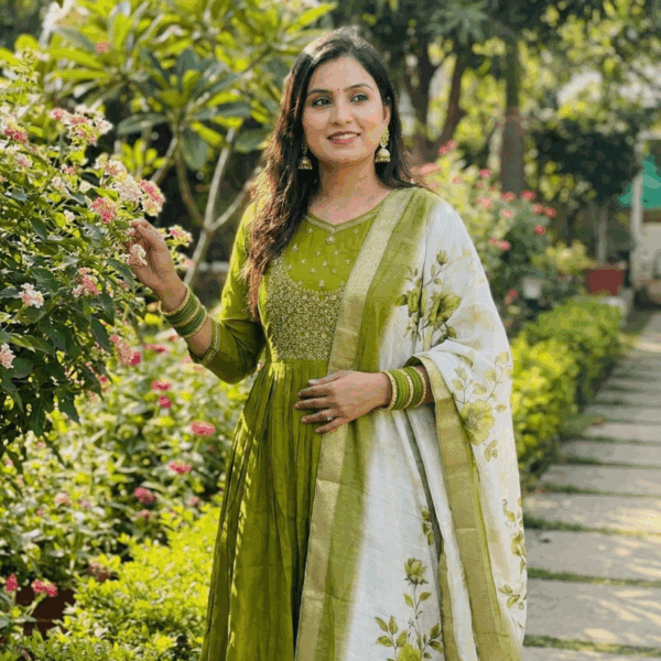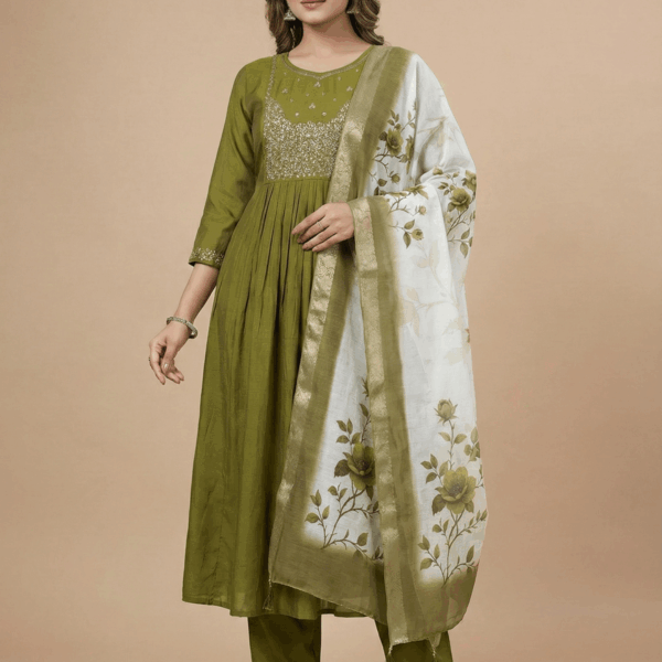 Ethnic wear -Women’s Olive Green Mul Chanderi Silk Salwar Suit with Floral Print Dupatta