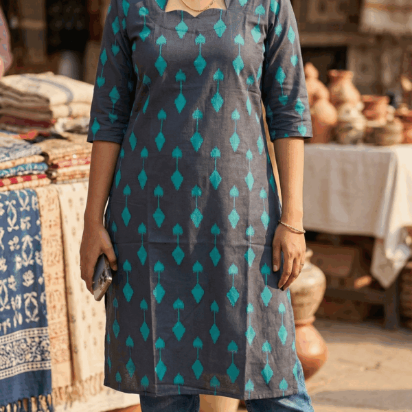 Women’s Green Ikkat Weave Top – Scallop Neck Design