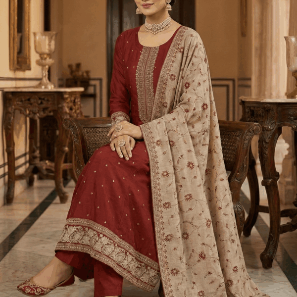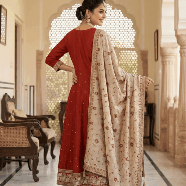 Ethnic wear – Anarkali -Rust orange Embroidered Silk Anarkali Suit Set with Contrast Dupatta
