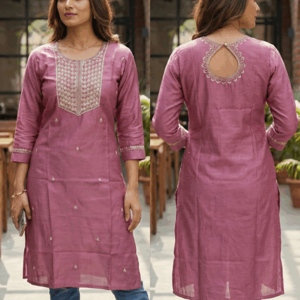Women’s Chanderi Silk Blend Straight Kurti with Zari Embroidery & Keyhole Back Design
